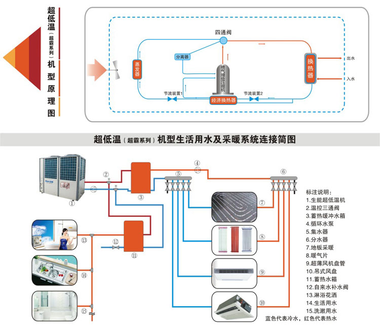 简单来水做一个温度的搬运工作,把室外空气中的热量搬运到水箱中,从而加热水温,产生高质量的热水。